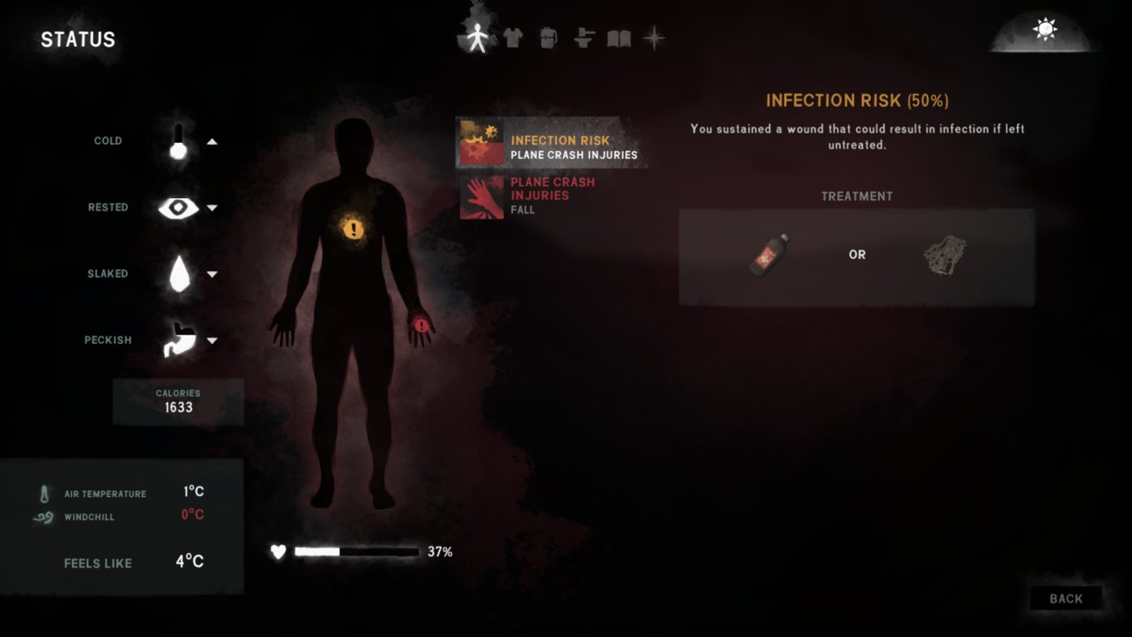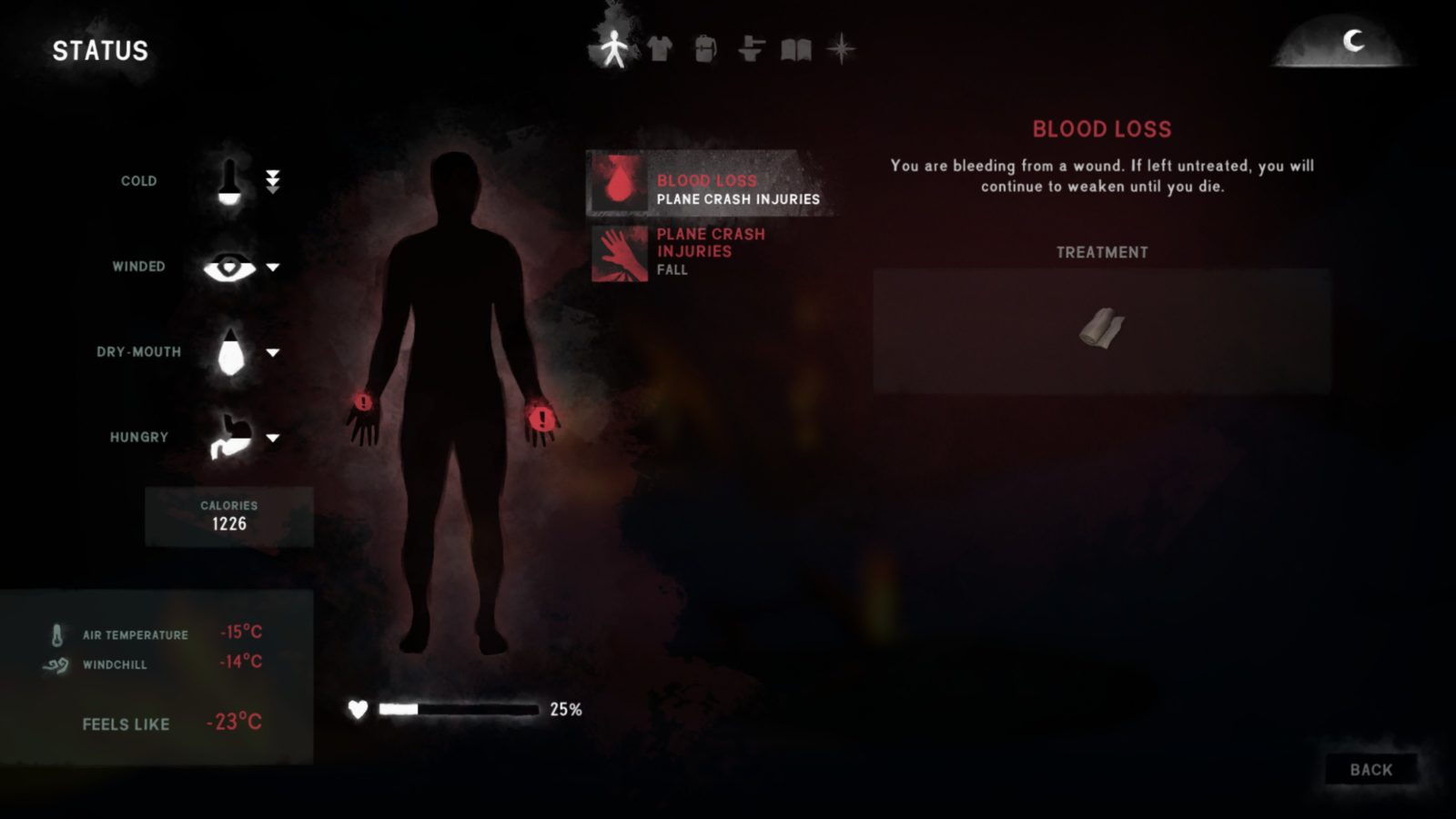 The status screen is where you can find more detailed information about your environment and condition. Here you’ll see that Will is suffering from the affliction of blood loss on his left hand. You’ll need to find a bandage to treat it before he dies. So walk around a bit until you find a first aid kit on the ground. The game will then walk you through using medications and other treatments.